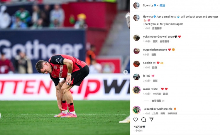 勒沃库森官方已经宣布维尔茨缺席主场迎战拜仁的欧冠次回合,并且将缺阵数周。他本人也通过社媒晒出自己的比赛照,并表示:“只是一次小考验????????‍♂️我将很快以更强的姿态回归????????????感谢球迷们发来的慰问信息。