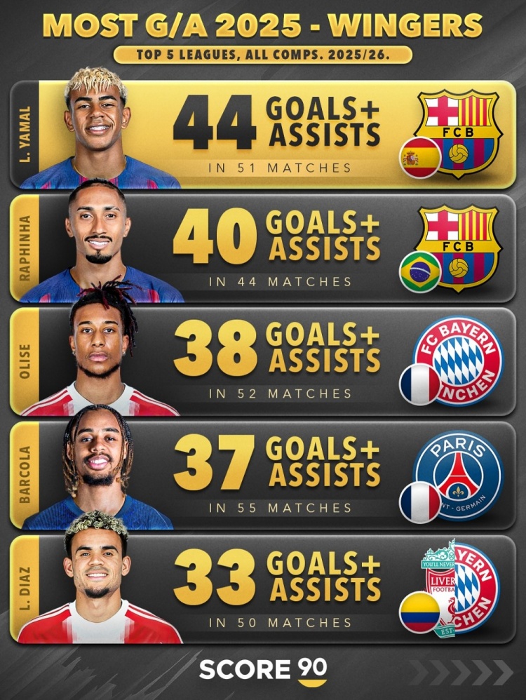 11月10日讯 Score90统计了2025年五大联赛边锋在俱乐部+国家队比赛中参与进球的数量,并列出榜单。