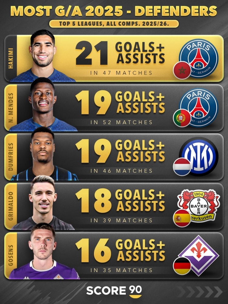 2025-11-11 00:03:04今年后卫参与进球榜:阿什拉夫21球居首,门德斯、邓弗里斯19球